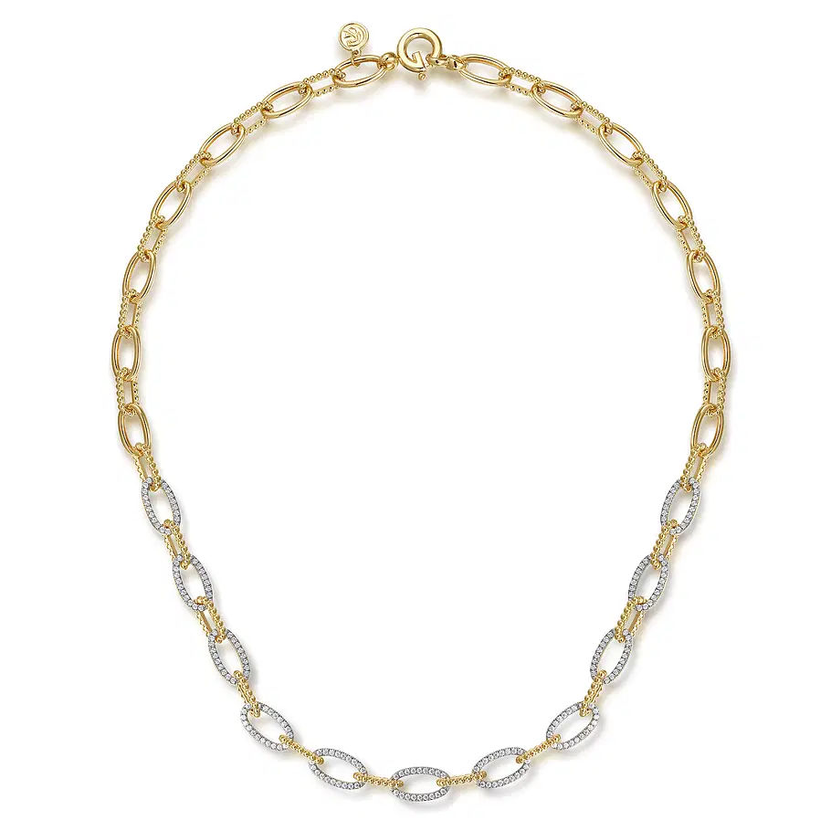 14K Yellow-White Chain Necklace woth Oval Pave Diamond Stations