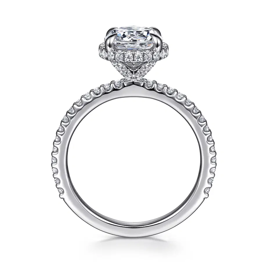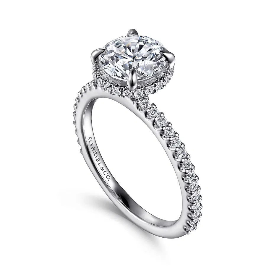 This 3 stone engagement ring brings two hearts together and honors promises kept forever. Designed to cradle a 2ct round-cut diamond of your choice in a half-bezel setting, it’s flanked by two pear-shaped stones on each side. A hidden Bujukan ball in the gallery adds the intimate detail meant just for you.